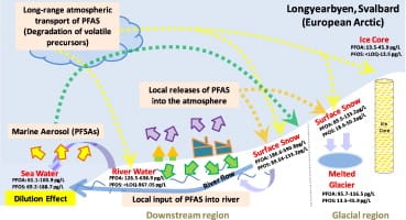 Description: Perfluoroalkyl substances (PFAS) have been globally detected in various environmental matrices, yet their fate and transport to the Arctic is still unclear, especially for the European Arctic. In this study, concentrations of 17 PFAS were quantified in two ice cores (n=26), surface snow (n=9) and surface water samples (n=14) collected along a spatial gradient in Svalbard, Norway. Concentrations of selected ions (Na(+), SO4(2-), etc.) were also determined for tracing the origins and sources of PFAS. Perfluorobutanoate (PFBA), perfluorooctanoate (PFOA) and perfluorononanoate (PFNA) were the dominant compounds found in ice core samples. Taking PFOA, PFNA and perfluorooctane-sulfonate (PFOS) as examples, higher concentrations were detected in the middle layers of the ice cores representing the period of 1997-2000. Lower concentrations of C8-C12 perfluorocarboxylates (PFCAs) were detected in comparison with concentrations measured previously in an ice core from the Canadian Arctic, indicating that contamination levels in the European Arctic are lower. Average PFAS concentrations were found to be lower in surface snow and melted glacier water samples, while increased concentrations were observed in river water downstream near the coastal area. Perfluorohexanesulfonate (PFHxS) was detected in the downstream locations, but not in the glacier, suggesting existence of local sources of this compound. Long-range atmospheric transport of PFAS was the major deposition pathway for the glaciers, while local sources (e.g., skiing activities) were identified in the downstream locations.