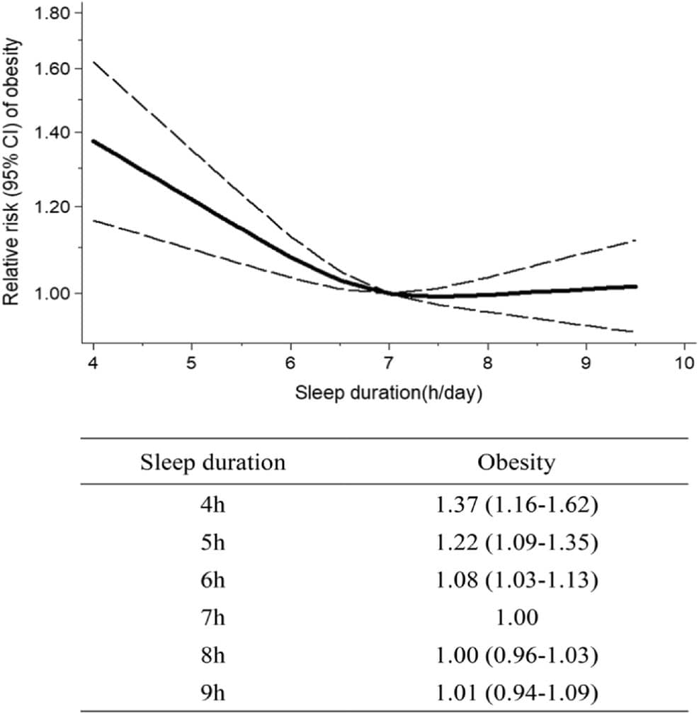 Description: The association between sleep duration and obesity risk remains unclear. We performed an updated meta-analysis to quantify a potential dose-response relation between sleep duration and risk of obesity. PubMed and Embase were searched for prospective cohort studies examining the association between sleep duration and risk of obesity that were published up to October 28, 2017. Random effects models were used to evaluate the pooled relative risks (RRs) and 95% confidence intervals (CIs) for the association of sleep duration and obesity. Restricted cubic splines were used to model the dose-response association. The meta-analysis included 12 studies (16 reports). We found a reverse J-shaped relation between sleep duration and obesity, with the lowest risk at 7-8-h sleep per day. Compared with 7-h sleep duration per day, the pooled relative risks for obesity were 1.09 (95% CI 1.05-1.14) for each 1-h decrement among individuals who slept <7 h per day and 1.02 (95% CI 0.99-1.05) for each 1-h increment of sleep duration among individuals with longer sleep duration. Short sleep duration significantly increased the risk of obesity. Compared with 7-h sleep duration per day, the risk of obesity increases 9% for each 1-h decrease in sleep duration.