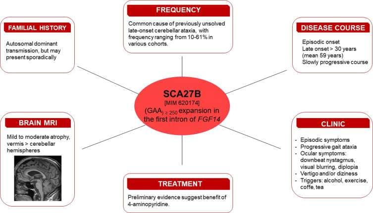 Description: Genetic cerebellar ataxias are still a diagnostic challenge, and yet not all of them have been identified. Very recently, in early 2023, a new cause of late-onset cerebellar ataxia (LOCA) was identified, spinocerebellar ataxia 27B (SCA27B). This is an autosomal dominant ataxia due to a GAA expansion in intron 1 of the FGF14 gene. Thanks to the many studies carried out since its discovery, it is now possible to define the clinical phenotype, its particularities, and the progression of SCA27B. It has also been established that it is one of the most frequent causes of LOCA. The core phenotype of the disease consists of slowly progressive late-onset ataxia with cerebellar syndrome, oculomotor disorders including downbeat nystagmus, and episodic symptoms such as diplopia. Therapeutic approaches have been proposed, including acetazolamide, and 4-aminopyridine, the latter with a better benefit/tolerance profile.