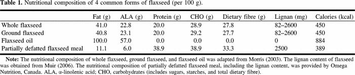 Description: Functional foods and nutraceuticals are becoming popular alternatives to pharmacological treatments by providing health benefits and (or) reducing the risk of chronic diseases. Flaxseed is a rich source of 3 components with demonstrated cardioprotective effects: the omega-3 fatty acid alpha-linolenic acid (ALA), dietary fibre, and phytoestrogen lignans. Multiple clinical dietary intervention trials report that consuming flaxseed daily can modestly reduce circulating total cholesterol (TC) by 6%-11% and low-density lipoprotein (LDL) cholesterol by 9%-18% in normolipemic humans and by 5%-17% for TC and 4%-10% for LDL cholesterol in hypercholesterolemic patients, as well as lower various markers associated with atherosclerotic cardiovascular disease in humans. Evidence to date suggests that the dietary fibre and (or) lignan content of flaxseed provides the hypocholesterolemic action. The omega-3 ALA found in the flaxseed oil fraction also contributes to the antiatherogenic effects of flaxseed via anti-inflammatory and antiproliferative mechanisms. Dietary flaxseed may also protect against ischemic heart disease by improving vascular relaxation responses and by inhibiting the incidence of ventricular fibrillation.